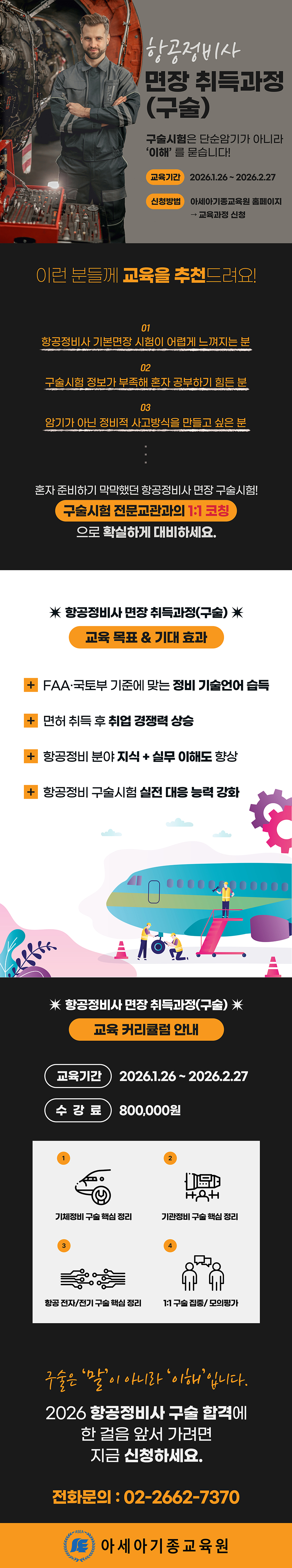 항공정비사 면허(구술) 과정안내| 26-1차 항공정비사 면장 취득과정(구술) 교육생 모집 | |||